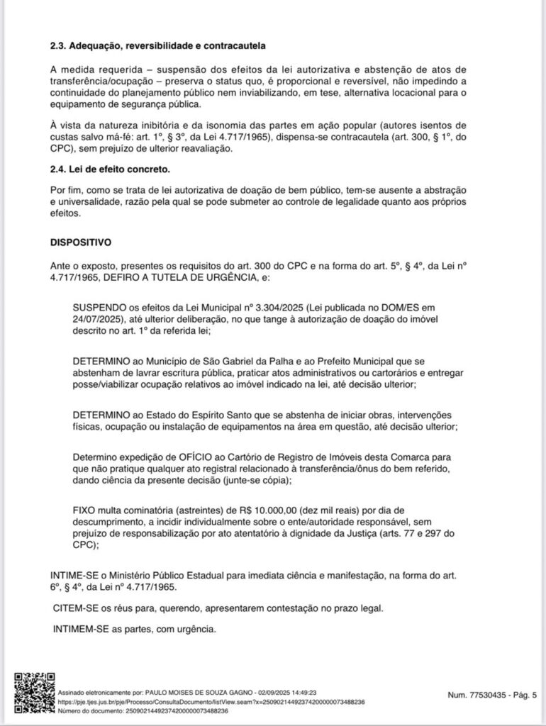 Com a liminar, ficam suspensos todos os efeitos da lei: o Município e o Prefeito Tiago Rocha não podem transferir ou permitir a ocupação do imóvel, e o Estado está proibido de iniciar obras no local, sob pena de multa diária de R$ 10 mil.