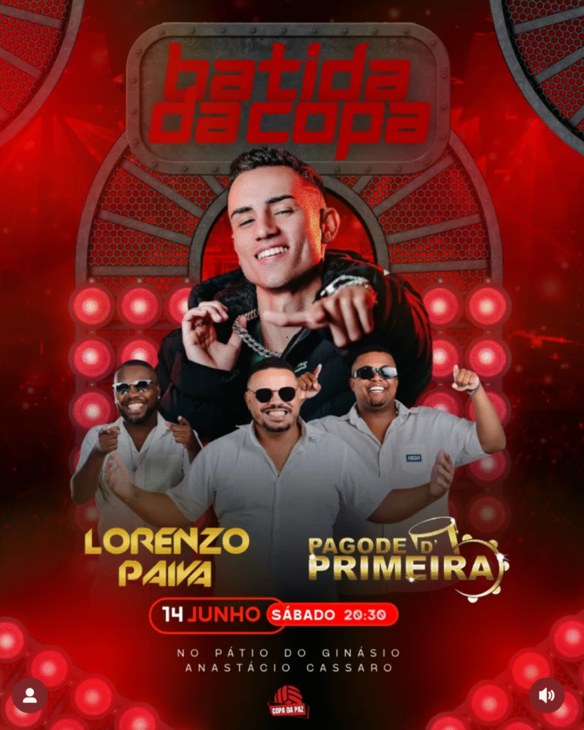 A energia da Copa da Paz vai ultrapassar as quatro linhas neste sábado, 14 de junho! A partir das 20h30, o pátio do Ginásio Anastácio Cassaro será palco de uma grande noite de música e animação com Lorenzo Paiva e o grupo Pagode D’Primeira.