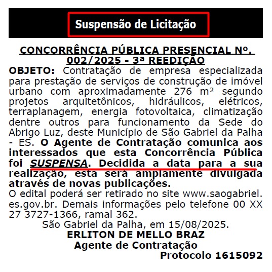 A Prefeitura de São Gabriel da Palha suspendeu novamente a Concorrência Pública Presencial nº 002/2025, referente à contratação de empresa especializada para construir a sede do Abrigo Luz, obra orçada em R$ 1.327.200,34. Esta é a quarta suspensão do processo.