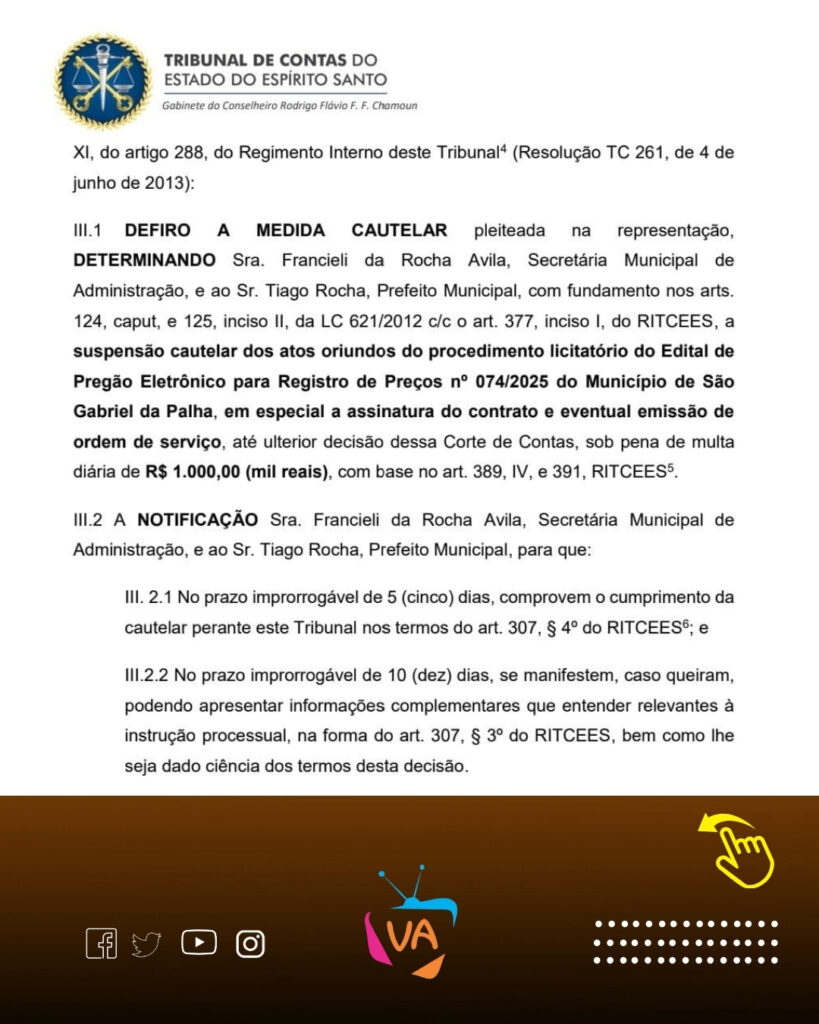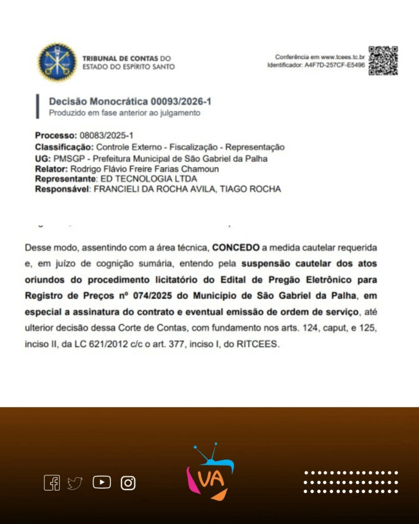 O Tribunal de Contas do Estado do Espírito Santo (TCE-ES) determinou a suspensão imediata do Pregão Eletrônico nº 074/2025, promovido pela Prefeitura de São Gabriel da Palha, que previa a contratação de soluções tecnológicas para modernização do sistema de videomonitoramento urbano.